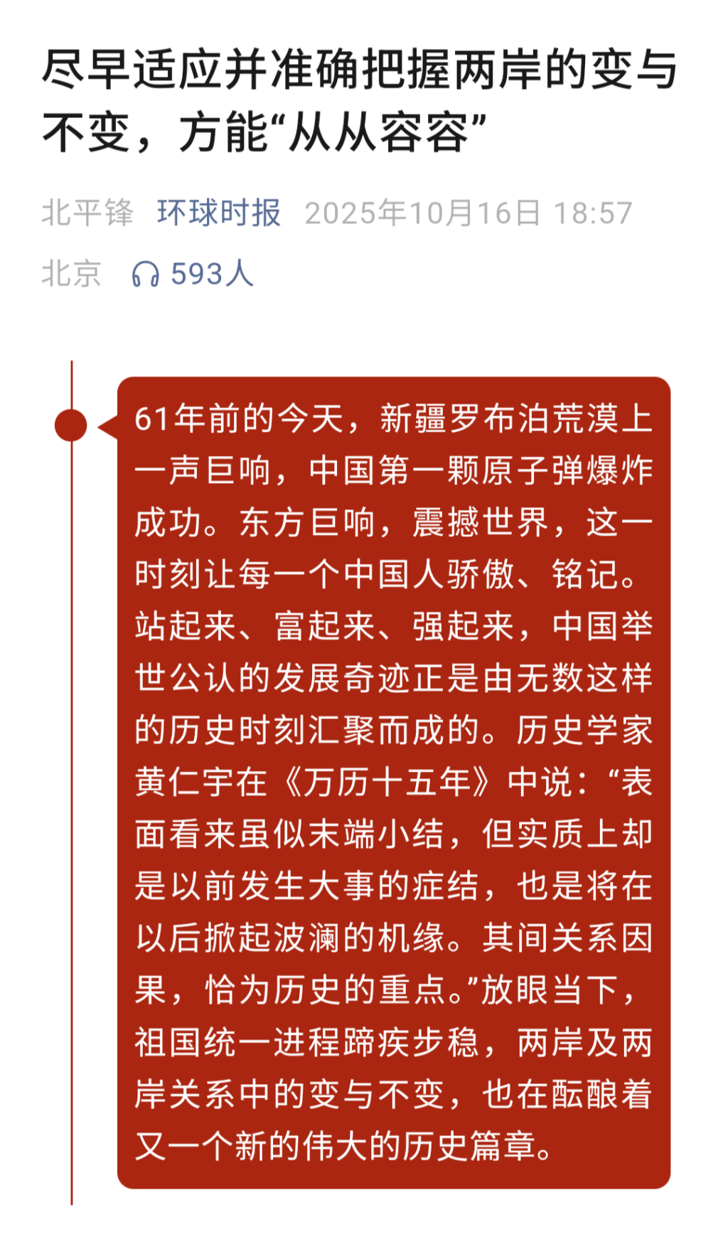 这篇评论巧妙地引用了两岸民众都很熟悉的历史学家黄仁宇在《万历十五年》的名句来观照两岸关系的“变”与“不变”。